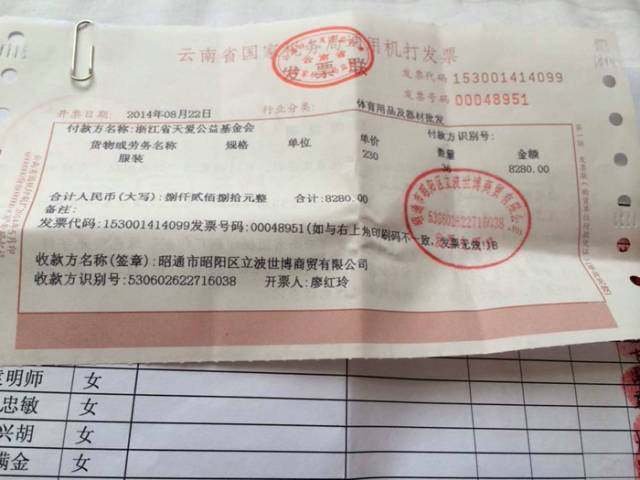 资助36位地震灾区学子每人一套服装单价230元/套 |