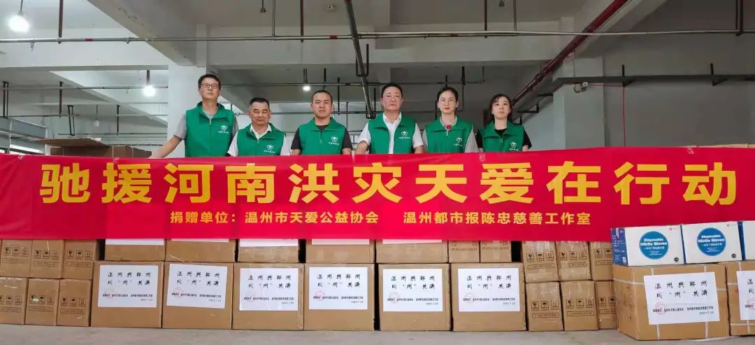 连日来,河南郑州等地发生特大暴雨引发了洪涝灾害,这场突如其来的灾情,牵动了温州人的心。昨天下午,温州市天爱公益协会联合温州都市报陈忠慈善工作室募集了首批10多吨的应急灯、多功能强光电筒、医用酒精、消毒液、口罩、医用手套、矿泉水等救灾物资,驰援河南刻不容缓!