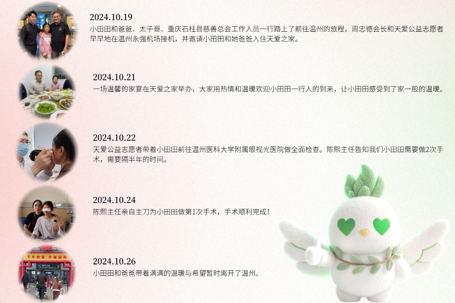 在此,我们要衷心感谢参与此次救助行动的每一位爱心人士,是你们的点滴善举汇聚成强大的力量,帮助小田田重见光明;感谢网红太子哥的积极传播,让小田田的故事被更多人知晓;感谢温州眼视光医院陈熙主任及医护团队的精湛医术······因为有你们,小田田的世界亮了,也因为有你们,这个世界变得更加温暖美好。