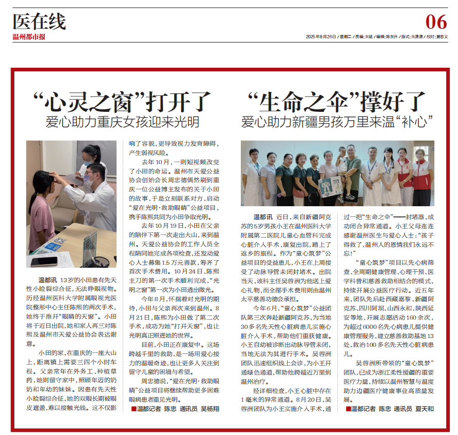 经过半年的恢复,2025年8月,小田田和父亲、太子哥及其团队、重庆石柱县慈善总会工作人员再次抵达温州,准备进行第2次手术。依旧由经验丰富的陈熙主任主刀,手术顺利完成!当纱布一点点被揭开,久违的光线洒进小田田的眼睛,她眼中的世界开始变得清晰起来。至此,小田田的眼睛彻底打开了,那扇紧闭多年的“窗户 终于被推开,阳光毫无保留地洒进她的世界。这不仅是视力的恢复,更是重拾了她对未来生活的信心。我们相信,小田田将以全新的视角去拥抱学习、拥抱生活,奔向美好的未来。