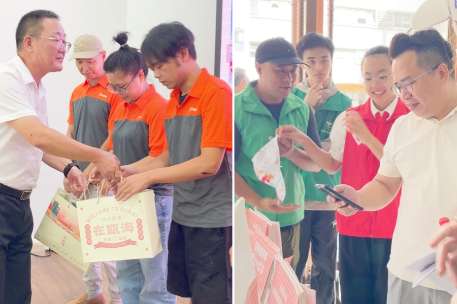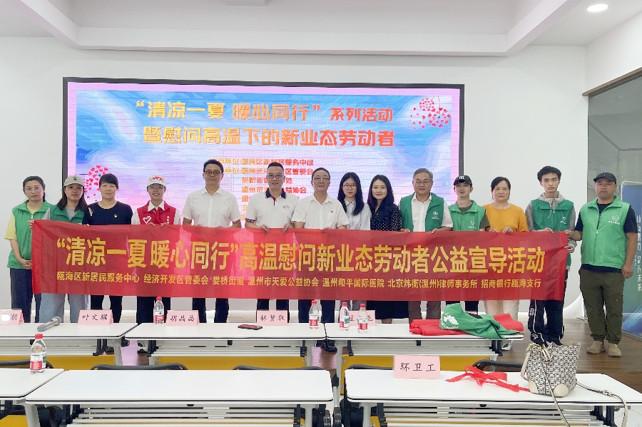 8月29日,我们联合瓯海区新居民服务中心、经济开发区管委会、娄桥街道、温州和平国际医院、北京炜衡(温州)律师事务所、招商银行瓯海支行等单位,我们开展“清凉一夏 暖心同行”高温慰问行动。聚焦外卖、快递等新业态劳动者,不仅送上防暑物资,更结合腾讯公益“爱在光明救助眼睛”项目公益宣导,倡导大家关注公益,一块做好事!(详情请看《清凉一夏,暖心同行!瓯海区多方联动为新业态群体送上“夏日关怀大礼包”》)