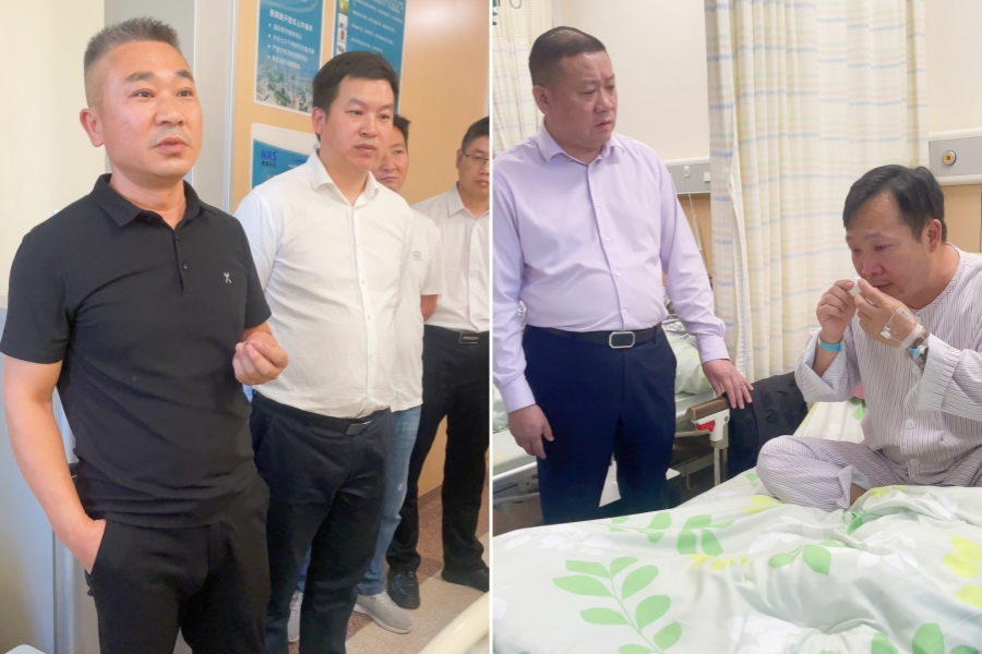 带着这份沉甸甸的爱心,商会老乡们来到了医院。当他们走进病房的那一刻,整个空间仿佛都被温暖填满。敖辉躺在病床上,当看到老乡们出现时,那眼神瞬间有了光彩。温州市随州商会会长刘本国紧紧握住敖辉的手,传达着对敖辉深深的关切。大家围在病床边,你一言我一语地询问着病情,话语中满是担忧和牵挂。敖辉见到老乡,瞬间打开了话匣子,仿佛见到亲人一般,有道不完的话。刘本国会长感慨道:“当收到天爱公益关于敖辉的消息后,我们感到非常惊讶。有两个没想到:一是没想到我们的老乡在这里遇到如此困境;二是没想到天爱公益能够如此关爱我们的随州老乡。我们非常感动,因此第一时间就发起爱心捐助活动,代表湖北随州老家的人、代表在温的老乡与企业,和天爱公益一起帮助敖辉渡过难关。”