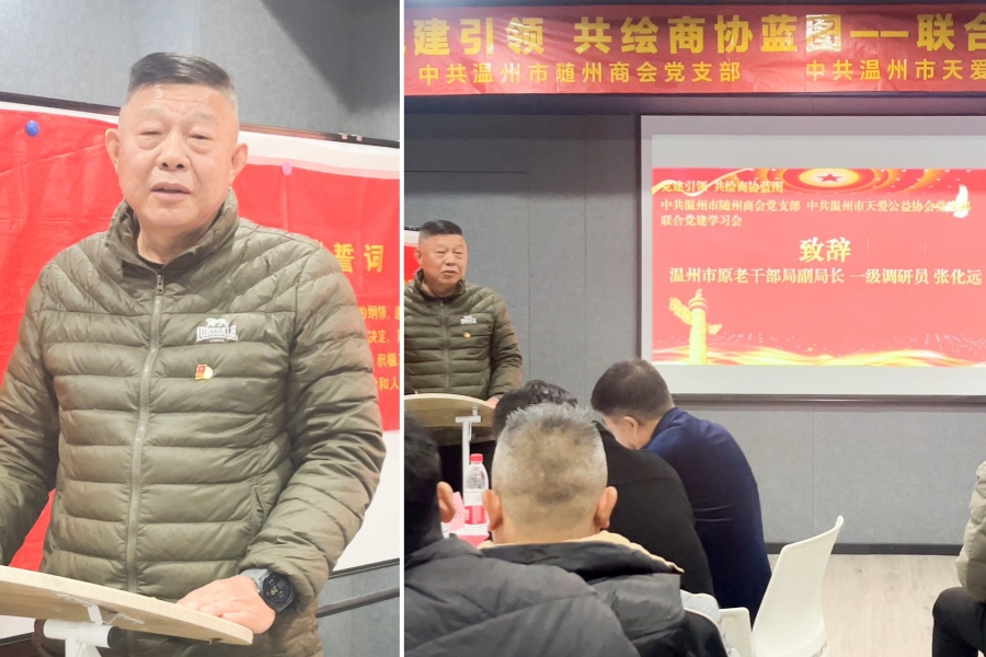 礼毕,温州市天爱公益协会拓展型党支部支部委员、协会执行会长庄朝龙上台致欢迎词。庄朝龙首先向远道而来的中共温州市随州商会党支部同仁致以最诚挚、最热烈的欢迎。随后,他讲道党建工作绝非是流于形式的例行公事,而是凝聚人心照亮前行道路的璀璨灯塔。天爱公益与随州商会因携手救助随州籍眼疾患者敖辉而结缘,以党建共建开展深入合作,也是公益慈善与商会的深度融合。