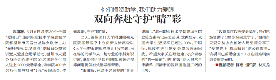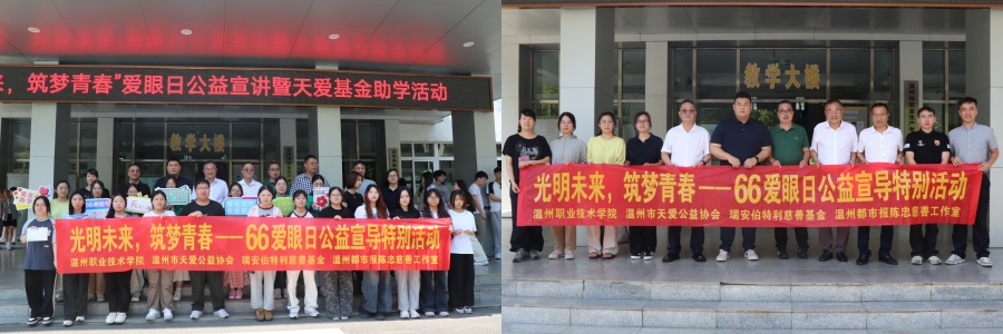 6月6日爱眼日,一场充满爱与希望的公益活动在温州职业技术学院鹿城学院热烈展开。天爱公益与温州职业技术学院鹿城学院携手举办的“光明未来,筑梦青春”公益宣导活动,不仅为学生们带来了爱眼护眼的实用知识,更以一个个温暖的公益故事,点燃了大家心中的善意之火。