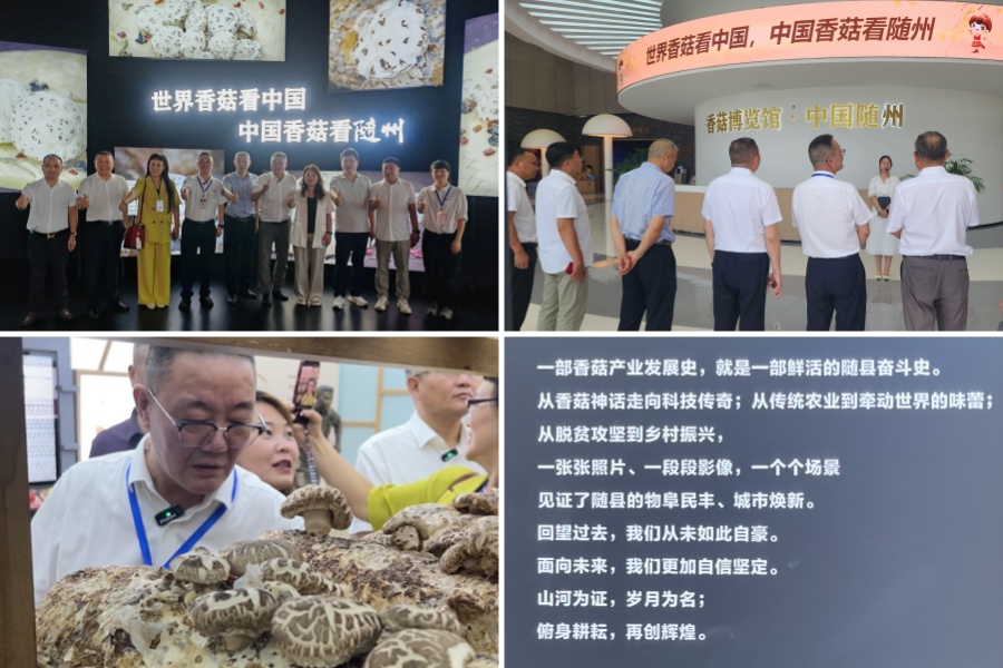 随后,一行人前往香菇博览馆。随州是闻名遐迩的“中国香菇之乡”,“世界香菇看中国,中国香菇看随州”,这句响亮的赞誉在博览馆内得到了生动诠释。从香菇的种植历史到现代产业体系,从本土培育到全球市场布局,我们深刻感受到随州香菇产业的深厚底蕴与全球影响力,也为这一“硬核”农产的推广前景充满期待。